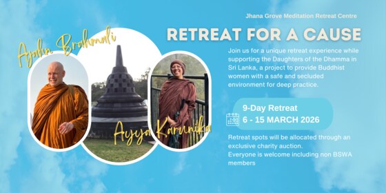 Places have become available on this retreat due to some cancellations. Please contact Christina on bookings-assist@bswa.org if you are interested in attending. This is a fundraising event for the Dhammadhita Project.   About the Teachers Ajahn Brahmāli first encountered Buddhism and meditation in his early twenties during a visit to Japan. After earning master’s degrees in engineering and finance, he travelled to Australia to train at Bodhinyana Monastery, where he took full ordination in 1996 with Ajahn Brahm as his preceptor. In 2025, he marks his 30th year as a Buddhist monk. A sought-after teacher, Ajahn Brahmāli regularly leads retreats across Australia, Southeast Asia, Sri Lanka, and Europe. He has authored numerous essays on key aspects of the Dhamma, including the legitimacy of bhikkhunī ordination, which he actively supports. In recognition of his contributions to Buddhist studies, he was awarded an Honorary Doctorate in 2023.   Bhikkhuni Ayya Kārunikā is currently the senior resident monastic at Santi Forest Monastery, NSW, Australia and the spiritual director for New Zealand Bhikkhuni Sangha Trust, Hamilton. She has been in monastic life for over 15 years and she received her full ordination as a bhikkhunī in 2014 at Dhammasara Nuns monastery in Western Australia where she lived and trained for over a decade with Ajahn Hāsapaññā. She has been a student of Ajahn Brahm and Ajahn Brahmali for over 2 decades. She has a passion to share her experience and knowledge and loves working with people and also doing creative projects. She is dedicated to supporting the growth of Bhikkhunis around the world and is currently involved in projects to support the establishment of places for Bhikkhunis in Theravada forest tradition in Australia, New Zealand, Poland and Sri Lanka.   About the Project Empowering Buddhist Women – Daughters of the Dhamma This project aims to provide equal opportunities for women in Sri Lanka to practice and serve on the Buddhist path. Led by Ajahn Brahmali, with the support of Ajahn Hasapanna, Ayya Karunikā, and Ayya Sela, the initiative focuses on: Education rooted in the Early Buddhist Texts and Early Vinaya Guidance in meditation practice Creating safe, secluded, and tranquil spaces for nuns and women to practice Offering a place for nuns and female practitioners from the West to stay, practice in a traditional Buddhist setting, and exchange experiences   Auction Spots will be allocated through online auctions. Auction 1 is closed! Auction 2 is closed! Final Auction 3 is closed! All donations made through the successful bids will be non-refundable. The bid amount will include the room bond which will be donated by Jhana Grove to this Project.  If you do not want to participate in the auction but prefers to be put on waitlist in case of cancellations, you will be contacted when there is a cancellation and if you are next on the Waitlist. A non-refundable donation of $300 will be appreciated. If you have a confirmed booking through the online auction, you may refer to https://bswa.org/getting-ready-retreat/ to start preparing for the retreat.